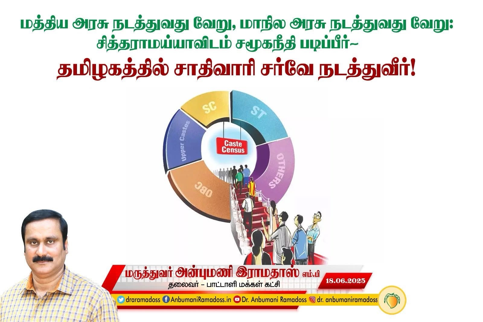 அப்படி ஒரு நிலை ஏற்படுவதைத் தடுப்பதற்காகத் தான் தமிழ்நாட்டில் சாதிவாரி மக்கள்தொகை சர்வே நடத்தப்பட வேண்டும் என்று பாட்டாளி மக்கள் கட்சி பல பத்தாண்டுகளாக வலியுறுத்தி வருகிறது. அத்தகைய சாதிவாரி சர்வேயை நடத்த சட்டப்பூர்வமாக எந்தத் தடையும் இல்லை. தமிழ்நாட்டில் அதற்கான மனிதவளம், நிதி ஆகிய எதற்கும் பஞ்சமில்லை. ஆட்சியாளர்களுக்கு தான் தமிழ்நாட்டு மக்களுக்கு சமூகநீதி வழங்க எண்ணம் இல்லை. தமிழ்நாட்டில் சமூகநீதி ஏற்றத்தாழ்வுகள் இப்போதுள்ளவாறே தொடர வேண்டும்; அடித்தட்டு மக்கள் அப்படியே நீடிக்க வேண்டும்; அவர்கள் முன்னேறி விடக் கூடாது என்ற வஞ்சக எண்ணம் தான் அவர்களின் நெஞ்சம் முழுவதும் நிறைந்திருக்கிறது. தமிழகத்தில் சமூகநீதி இருள் சூழ இதுவே